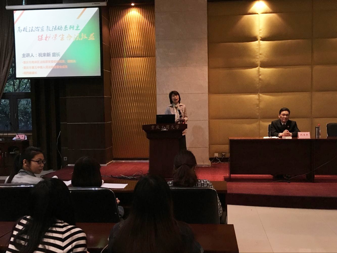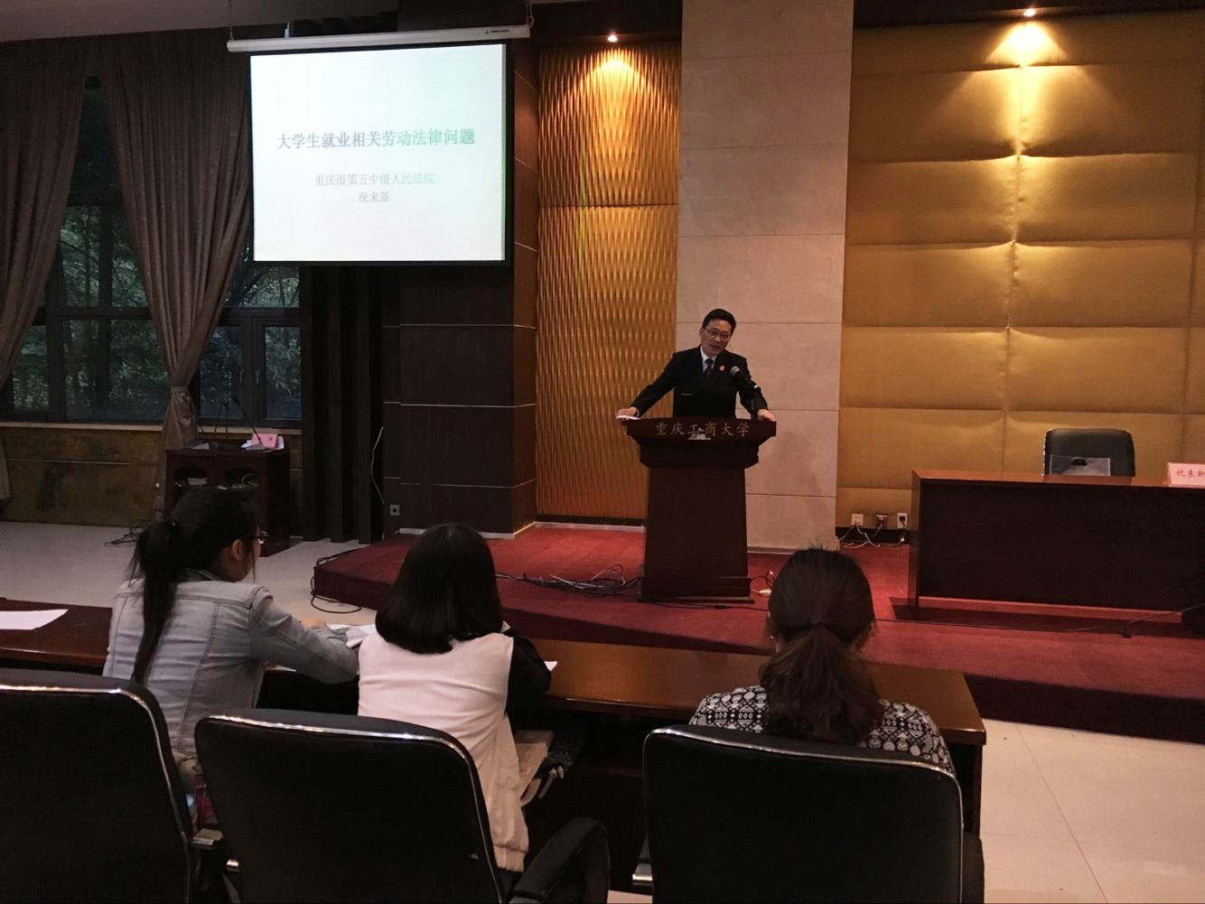 2016年4月26日晚,高校法治宣教活动系列之保护学生合法权益法律讲座在田家炳书院408报告厅成功召开。重庆市南岸区法院原党委组织成员、副院长,重庆市第五中级人民法院省委会成员、民四庭庭长祝来新;原重庆市南岸去法院副院长、原重庆市第五中级人民法院宣教处副处长陈绍惠受邀就大学生就业相关劳动法律问题进行知识宣讲。财政2003网站太阳集团党总支杨萍书记、分团委徐阔书记、校友联络员杨佳妮及校友代表张明佳出席了本次讲座。