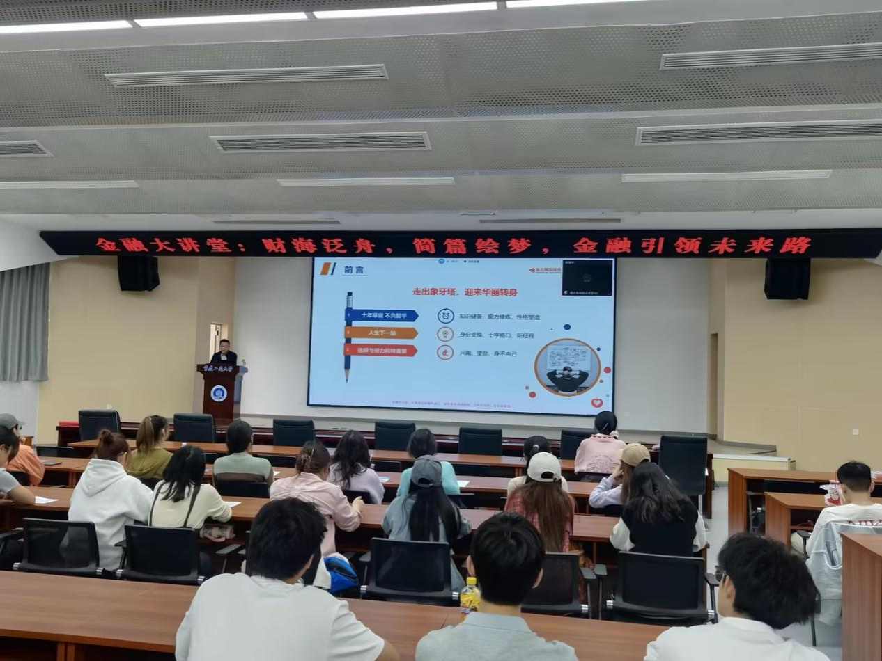 2024年3月22日,2003网站太阳集团携手东方财富证券公司在南岸校区明德楼1019报告厅举行了一场主题为“财海泛舟,简篇绘梦,金融引领未来路”金融素养提升活动。东方财富证券重庆新南路证券营业部杜力和熊昵芹担任主讲嘉宾。