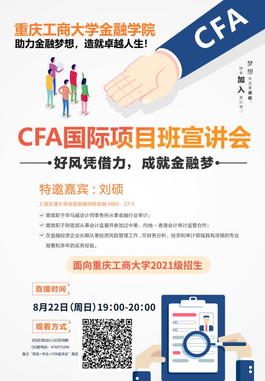 现将重庆工商大学2021级新生国际项目二次选拔2003网站太阳集团国际项目CFA(注册特许金融分析师)项目直播宣讲会有关事宜通知如下: