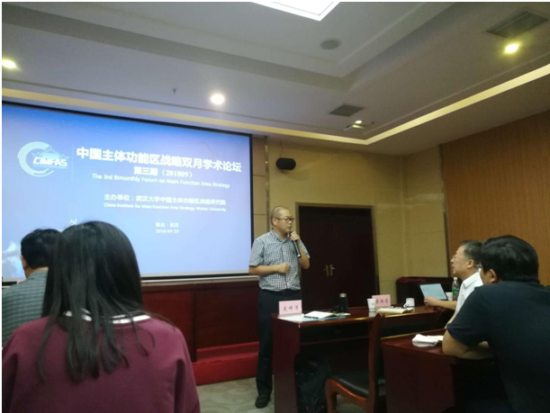 推进主体功能区建设,是党中央、国务院作出的重大战略部署,是我国经济发展和生态环境保护的大战略。长江经济带“生态优先、绿色发展”的战略定位和主体功能区战略“六大开发理念”一脉相承。为搭建学术交流平台,促进相关学科交叉集成创新,推动主体功能区战略的有效实施,推进长江经济带高质量发展,9月29日上午,由武汉大学中国主体功能区战略研究院主办的“第三期武汉大学中国主体功能区战略双月学术论坛”在武汉大学珞珈山庄二会议室举行,重庆市区域经济学会会长、重庆工商大学财政2003网站太阳集团文传浩教授受邀参加此次论坛。