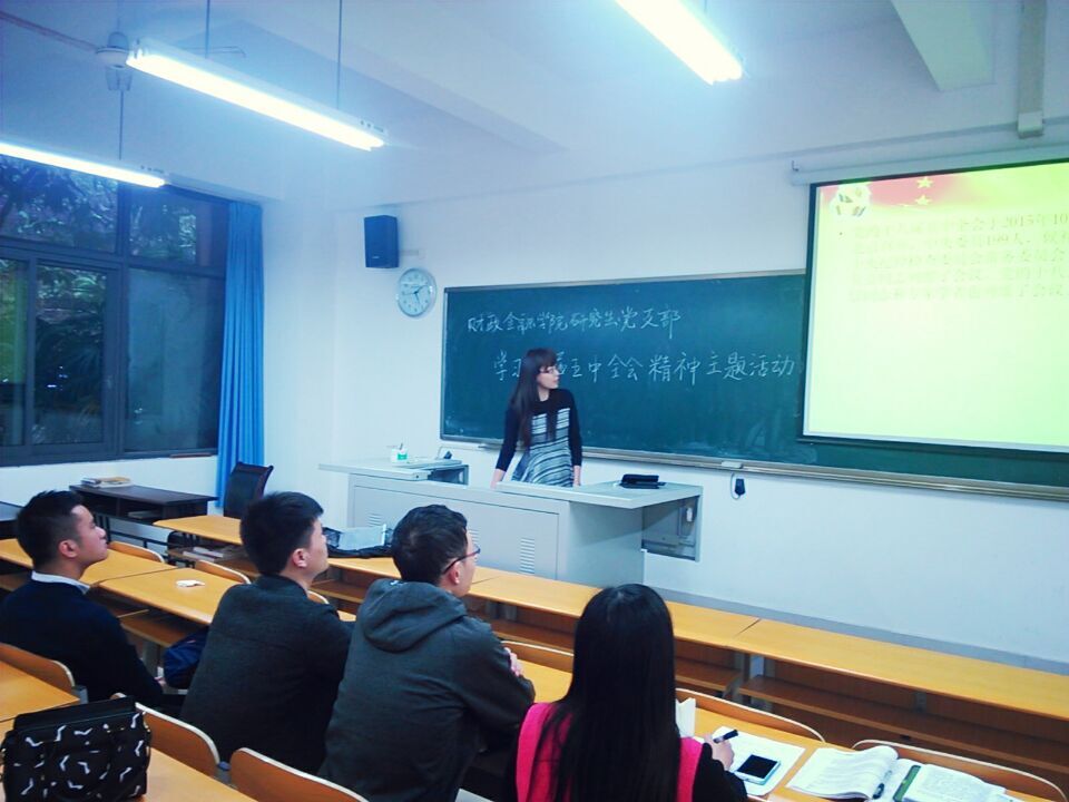 支部宣传委员黄晓同志做学习党的十八届五中全会精神PPT汇报,介绍了大会的概况,对《中共中央关于制定国民经济和社会发展第十三个五年规划的建议》进行详细宣讲。支部全体成员对会议出现的新词、热词进行了热烈讨论,尤其关注十三五规划建议对未来生活的影响。大家一致认为,作为学生党员,应该勤学善思、求真笃行,成长为社会需要的复合型人才,为实现全面建成小康社会的奋斗目标贡献力量。