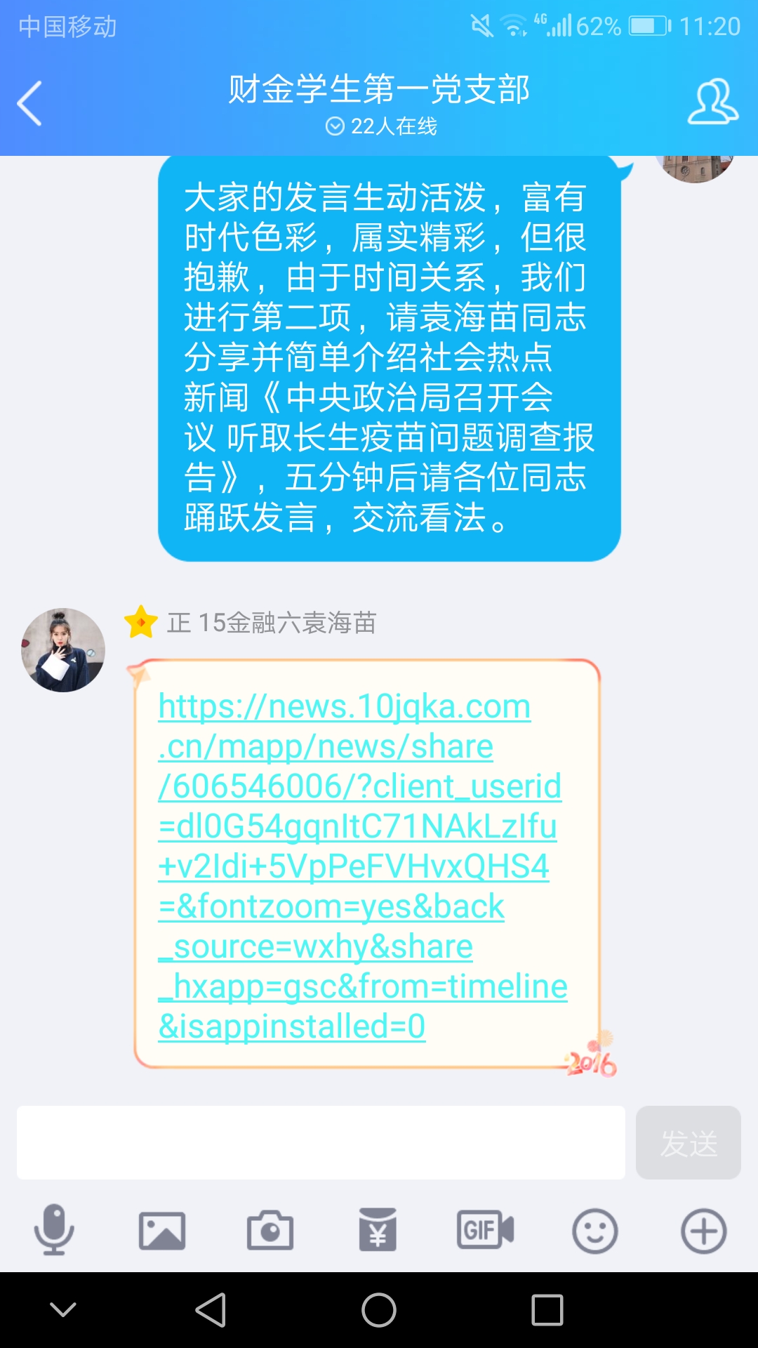 在分享讨论社会热点新闻的环节中,袁海苗同志分享了题目为《中央政治局召开会议,听取长生疫苗问题调查报告》的新闻,并简单介绍了“疫苗事件”的经过。在讨论时间里,针对疫苗问题产生的原因,党员同志们讨论十分激烈,逐渐围绕着戴琰婷同志提出的“逐利论”和袁海苗同志提出的“成本论”展开思考。