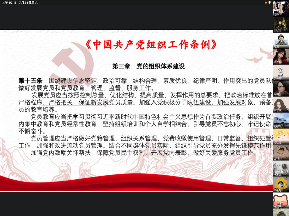 会议正式开始,本次会议由尚飒同志担任领学人。学习内容分为以下三个板块:一、学习习近平总书记七一重要讲话。二、学习习近平在“七一勋章”颁授仪式上的讲话。三、《中国共产党组织工作条例》、《中国共产党党徽党旗条例》。
