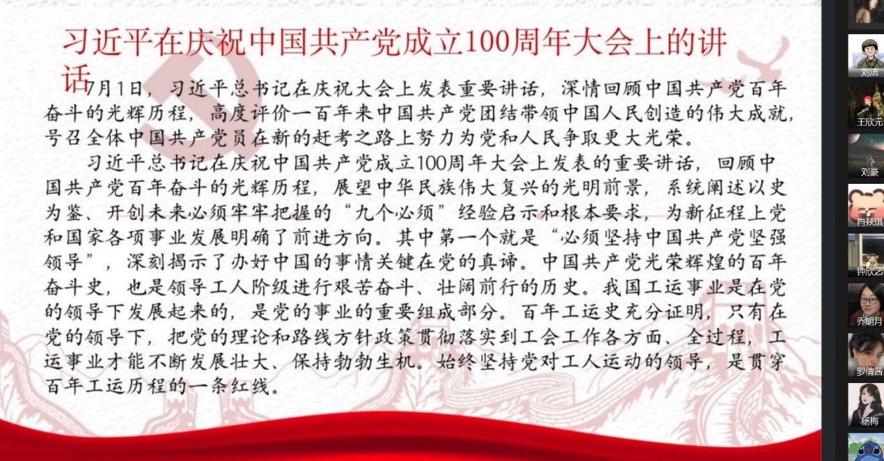 全体支部参会同志认真学习了习近平在庆祝中国共产党成立百年大会上的重要讲话精神,深刻认识党团结带领人民在百年接续奋斗中开辟的伟大道路、创造的伟大事业、取得的伟大成就,深刻总结党在百年奋斗历程中积累的宝贵经验,以史为鉴、开辟未来。