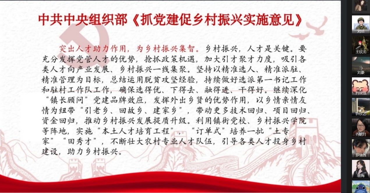 会议指出,《抓党建设促乡村振兴实施意见》要求贯彻落实党中央关于全面推进乡村振兴的决策部署,以更高的标准、更大的力度、更实的举措抓党建促乡村振兴,在巩固拓展脱贫攻坚成果、全面推进乡村振兴、加快农业农村现代化中展现新担当新作为。