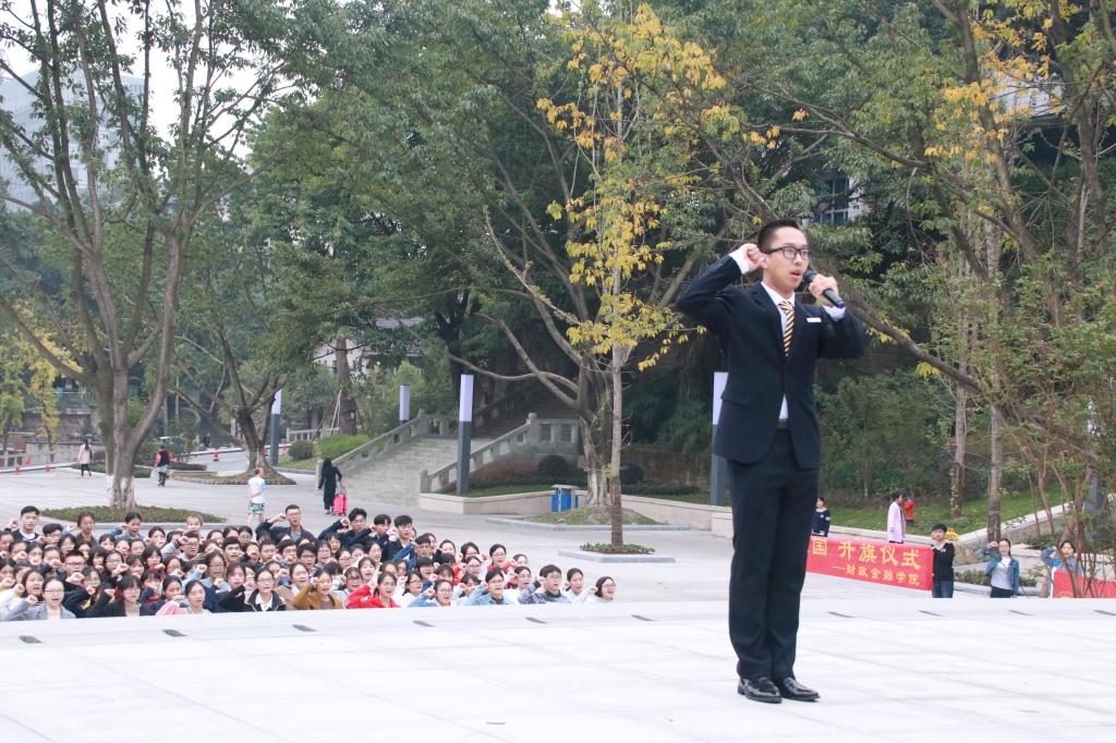 仪式第一项,出旗。由英姿飒爽的国旗护卫队护送鲜艳的五星红旗进场。此时,随着主持人杨润琼的一声振奋人心的:“升国旗,奏唱国歌,全体行注目礼”,鲜艳的五星红旗随着庄严的国歌声冉冉升起,财金学子庄严肃穆地注视着五星红旗,嘹亮的国歌声震人心弦,充分表达出对祖国无限的热爱和崇高的敬意。