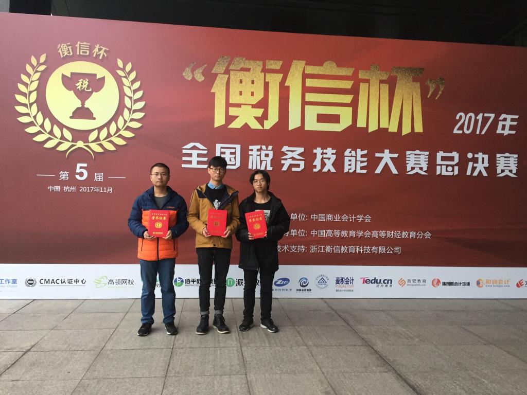 2017年11月28日下午,财金学院学生李东东、李大为、冉健宏代表我校前往杭州参加2017年“衡信杯”全国税务技能大赛总决赛。