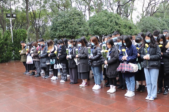 上午九点,志愿者们手捧菊花进入烈士陵园,庄重站立在烈士墓前。主持人向烈士纪念碑鞠躬,宣布悼念仪式正式开始。随后,主持人宣读祭文,全体志愿者在主持人的带领下向革命烈士默哀三分钟。志愿者代表宣讲了烈士事迹和革命故事,他们慷慨就义的精神激起了志愿者们心中对革命烈士的尊敬和浓烈的爱国热情。五名志愿者慷慨激昂的朗诵、烈士墓前的庄严宣誓,将全体志愿者的爱国热情推向顶峰。在对烈士纪念碑进行三鞠躬后,全体志愿者怀着尊敬而又沉痛的心情上前向革命烈士们敬献花束,并有序地绕墓园行走一圈。主持人宣布活动结束后,全体志愿者在烈士陵园前合影留念。