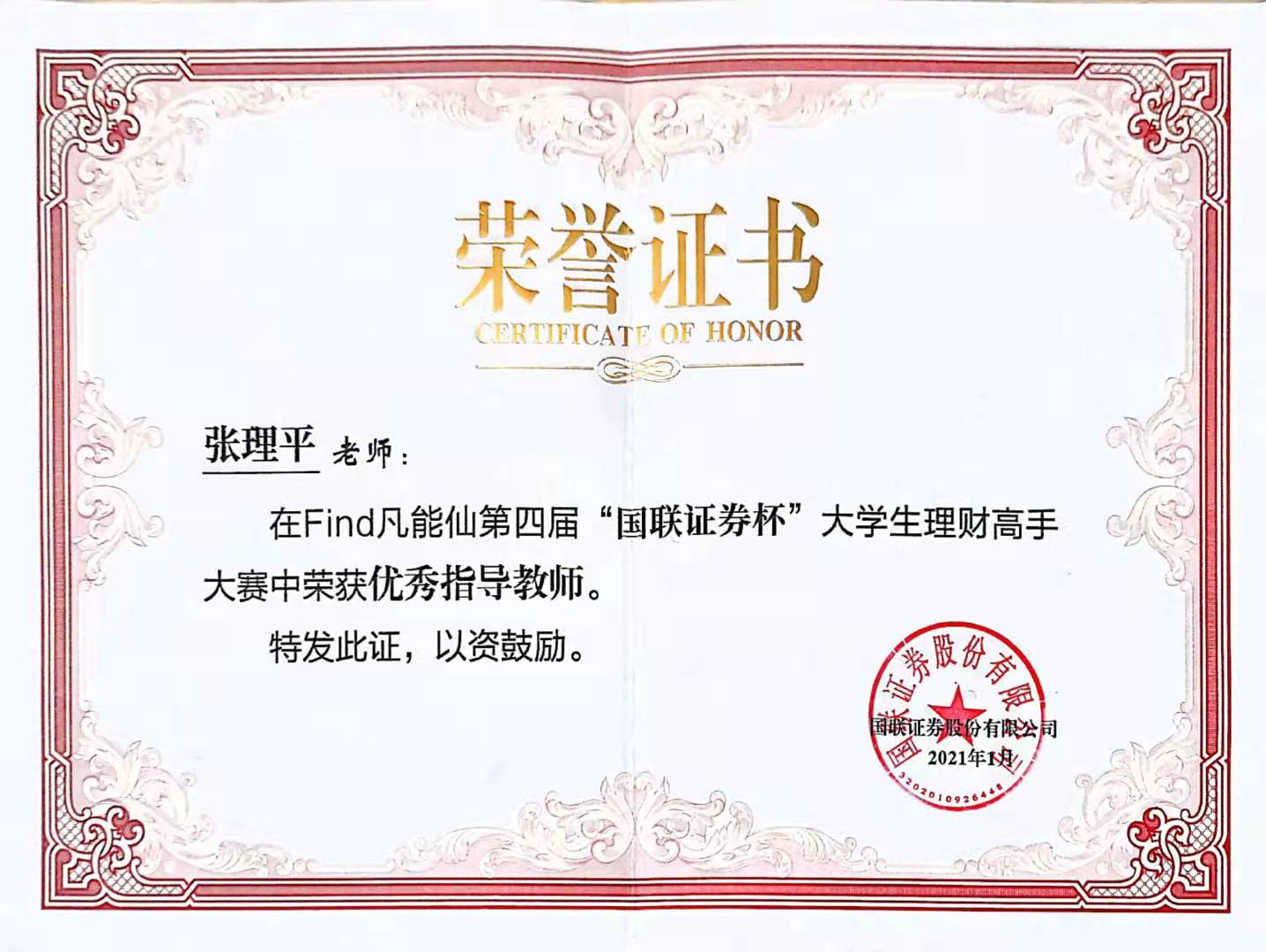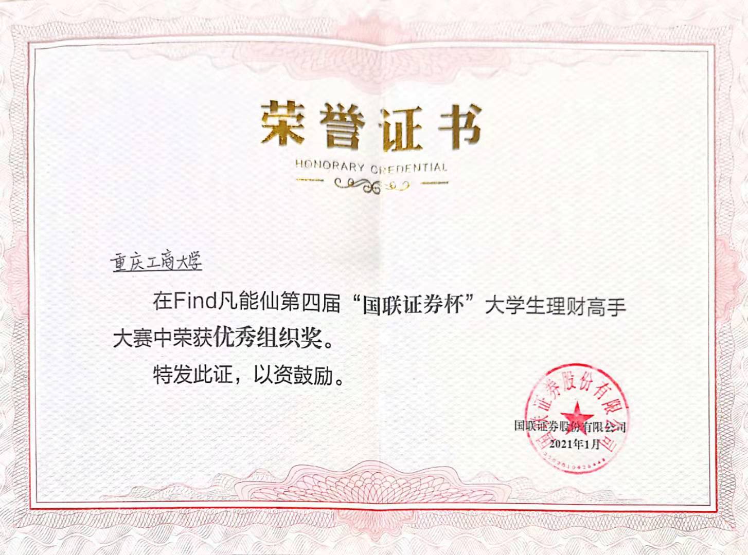 2021年1月10日,第四届“国联证券杯”-Find“凡能仙”大学生理财高手大赛决赛暨颁奖仪式圆满落幕,重庆工商大学代表队荣获“优秀组织奖”。金融工程专业张理平老师荣获“优秀指导教师奖”。在基金理财个人赛中,我校蒋涵月获得“二等奖”,杨松获得“三等奖”,寇力元,许梦茹等同学荣获“优秀奖”。