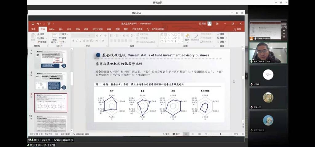 比赛中各团队进行了激烈的角逐,对于所有参赛学子来说,这不仅是一场线上直播体验,更是一场思维碰撞。决赛分为课题汇报及问答两个环节,每个代表队推选一至两名同学作为发言人,以PPT的形式对所选课题的成果进行汇报,并回答评审团提问。重庆工商大学的参赛选手在这个舞台上,传达他们独特的投资理念;讲解金融行业动态以及未来趋势;呈现业界、学界多维度思维分析的能力;展现出工商学子蓬勃的求知欲和巨大的可能性!