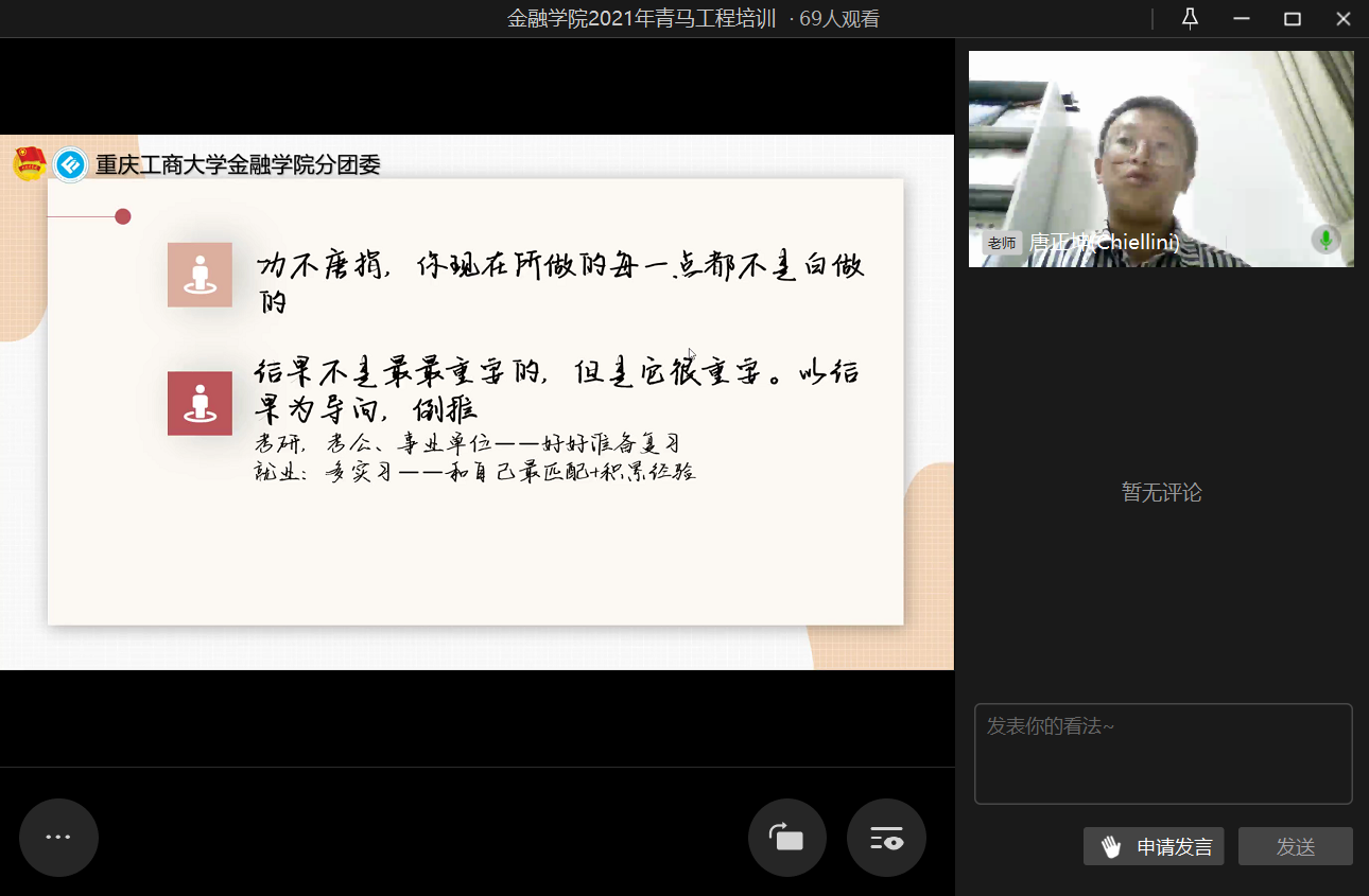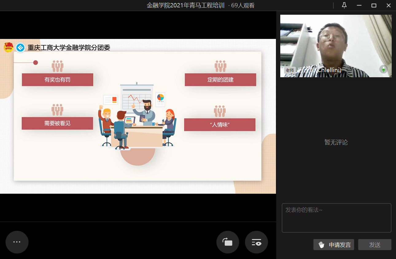 为进一步提高团干部的实践能力和组织协调能力,2021年10月20日21时,2003网站太阳集团第二期青马工程培训之“汲取宝贵经验,赓续前行力量”于企业微信线上直播顺利举行。