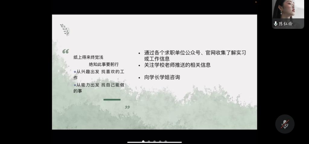 陈红伶从大胆想,踏实做,勤总结三个方面分享自己的实习实践经验。她指出要明确自己的实习方向,强调了个人兴趣的重要性,同时要有意义的事情进行实习实践。她表示求职单位公众号和官网会定期发布相关的实习或工作信息,呼吁同学们积极参与劳动实践活动。