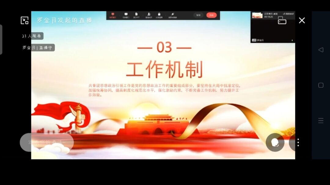 活动在庆祝中国共青团成立100周年主题宣传片《共青春》主题曲《有我》的青春问答中拉开,同学们在细腻而又气势磅礴的旋律中感受一代代不负时代重托的中国青年模样。随后,2003网站太阳集团分团委组织部部门负责人罗金月领学,内容涵盖团中央发布的《新时代加强和改进共青团思想政治引领工作实施纲要》及习近平总书记在中国人民大学考察时的重要讲话精神。她对《新时代加强和改进共青团思想政治引领工作实施纲要》中主要项目、基本方法、工作机制的具体规定进行详细讲解,在讲到开展劳动教育板块,号召同学们以五月“劳动月”为契机,积极投入到志愿服务、专业实践、社会调研等活动,把养成劳动习惯、强化劳动情感、掌握劳动技能结合起来,传播“崇尚劳动、热爱劳动、辛勤劳动”的道德风尚。在分享习近平总书记在中国人民大学考察时的重要讲话精神时,同学们纷纷表示备受鼓舞,深受感染,将牢记嘱托,“不负韶华,不负时代,不负人民,在青春的赛道上奋力奔跑,争取跑出当代青年的最好成绩”!