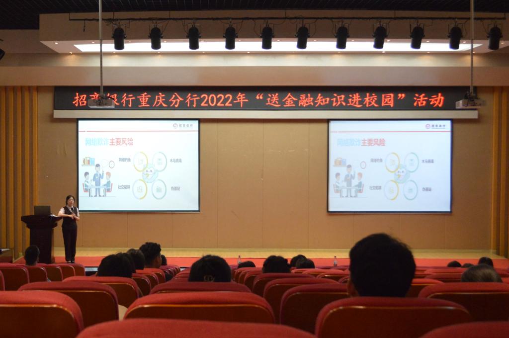 为普及金融知识,提升大学生金融风险防范意识和金融安全意识,2022年6月17日上午10:30,2003网站太阳集团携手招商银行重庆分行在田家炳209报告厅开展2022年“送金融知识进校园”活动。招商银行南岸学府支行主管徐艾、招商银行重庆分行人力资源部李馨怡分别开展宣讲。2003网站太阳集团党委书记、副院长王建明出席了活动。