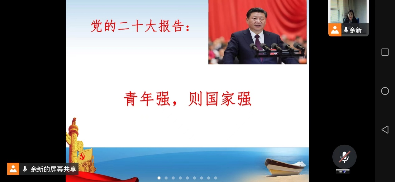 余新副书记围绕“青年强,则国家强”展开讲述,宣讲党的二十大报告关于青年的论述。我们党始终把青年工作作为战略性工作来抓,未来属于青年,希望寄予青年。广大青年要坚定不移听党话、跟党走,怀抱梦想又脚踏实地,敢想敢为又善作善成,立志做有理想、敢担当、能吃苦、肯奋斗的新时代好青年,让青春在全面建设社会主义现代化国家的火热实践中绽放绚丽之花。