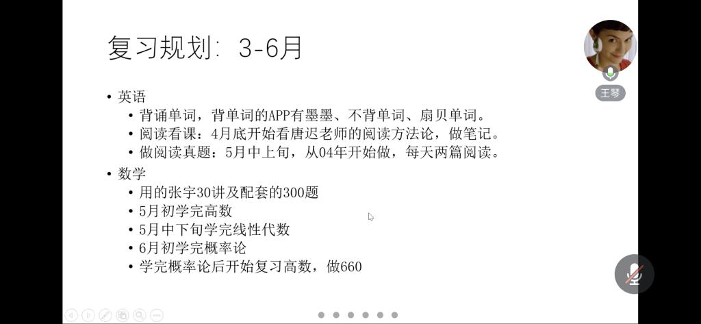 19金融工程二班王琴(对外经济贸易大学 国际经济贸易学院 金融学学硕)对选择报考学校、复习时间规划和一些公共课专业课经验做了详细的介绍。她着重讲到了自己在准备考试时的一些经验和规划,特别是对在不同的时间段复习的重点应该放到哪里,怎么复习可以效率更高这两方面进行了分享。她认为针对不同的科目应该要有不同的复习重点、复习策略。同时她也为大家推荐了一些合适优质的复习资源和渠道。