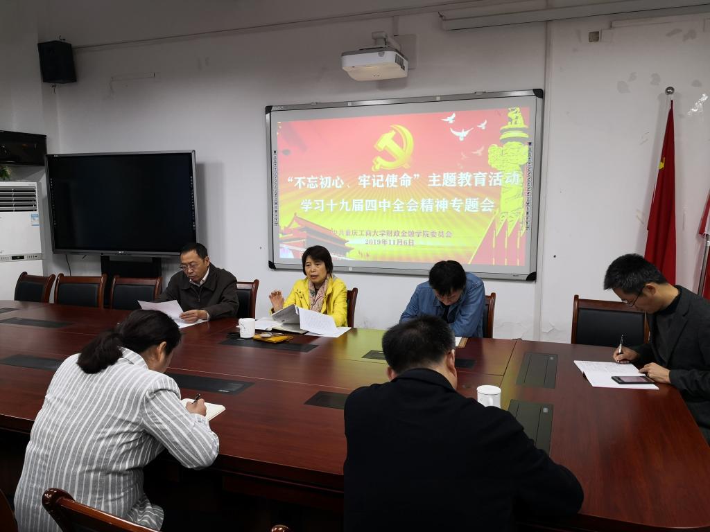 11月6日,财政2003网站太阳集团党委召开专题会贯彻学习领会十九届四中全会精神。会议由党委书记杨萍主持,班子全体成员参加了学习。