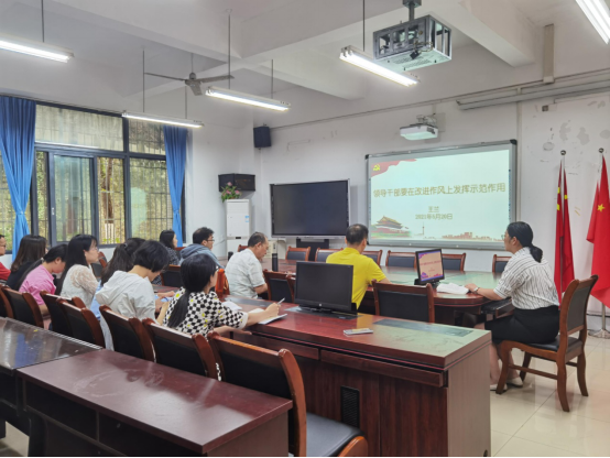 王兰同志以习近平总书记《领导干部要在改进作风上发挥示范作用》讲话精神为主要内要,结合工作实际分别从正确认识和处理人际关系,做到既有人情味又按原则办、下决心减少应酬,保持健康的工作方式和生活方式、实实在在做人做事,不搞“假大空”、 对一切腐蚀诱惑保持高度警惕,防微杜渐四个方面进行了讲述。辅以案例分析了教师如何教书育人、行政干部如何管理育人、如何以实际行动关系教师和爱护学生。