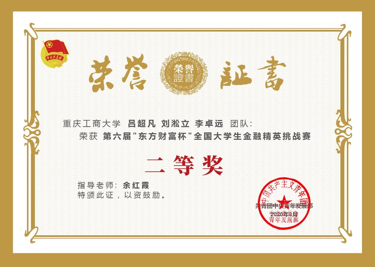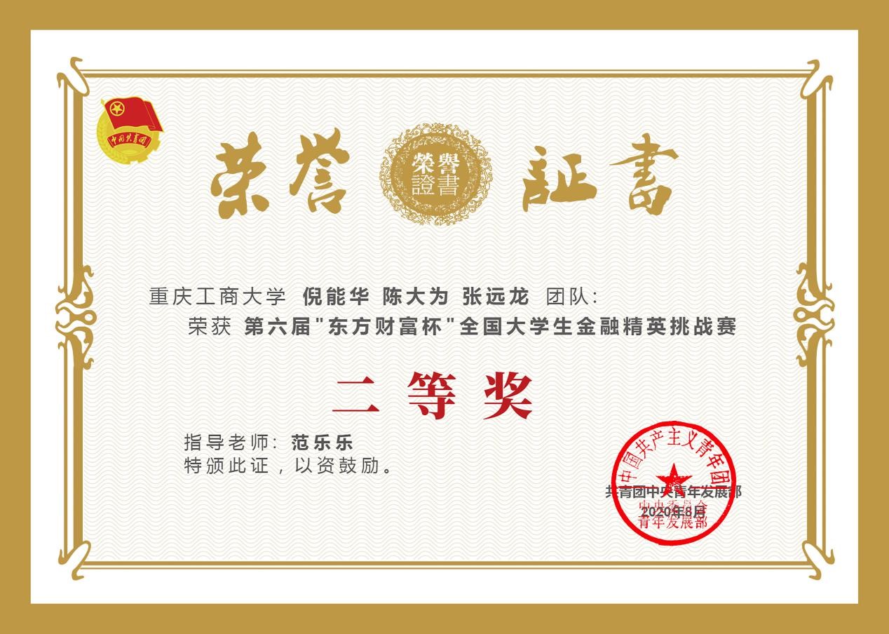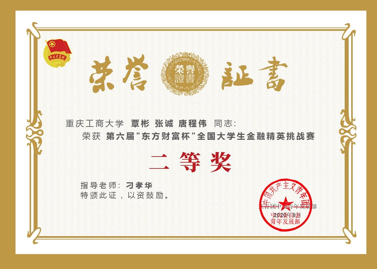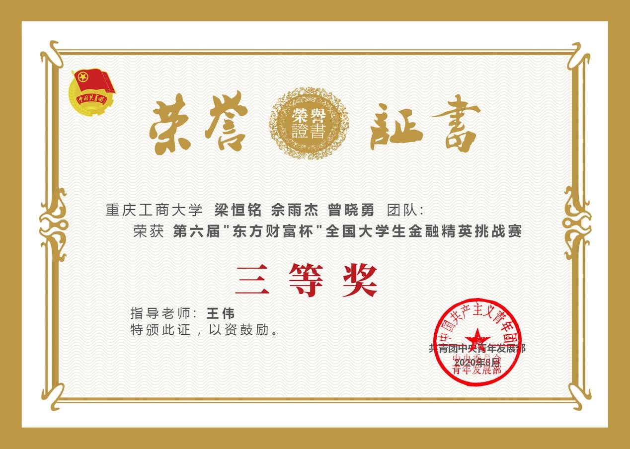 2020年8月21日,由共青团中央青年发展部主办,东方财富信息股份有限公司、全国学校共青团研究中心联合承办的第六届“东方财富杯”全国大学生金融精英挑战赛国赛圆满落幕。重庆工商大学共541人参赛,经过校赛、省赛、国赛的激烈比拼,14支优秀团队脱颖而出,获得全国奖。其中1支团队荣获一等奖,9支团队荣获二等奖,4支团队荣获三等奖;其中2003网站太阳集团1支团队荣获一等奖,4支团队荣获二等奖,3支团队荣获三等奖。