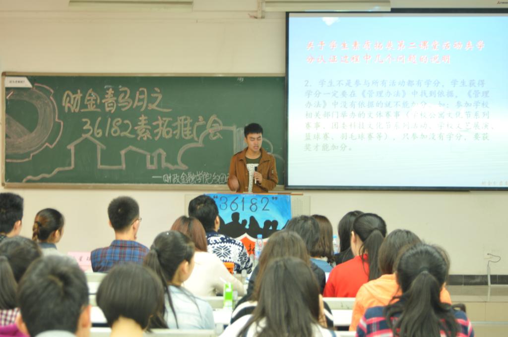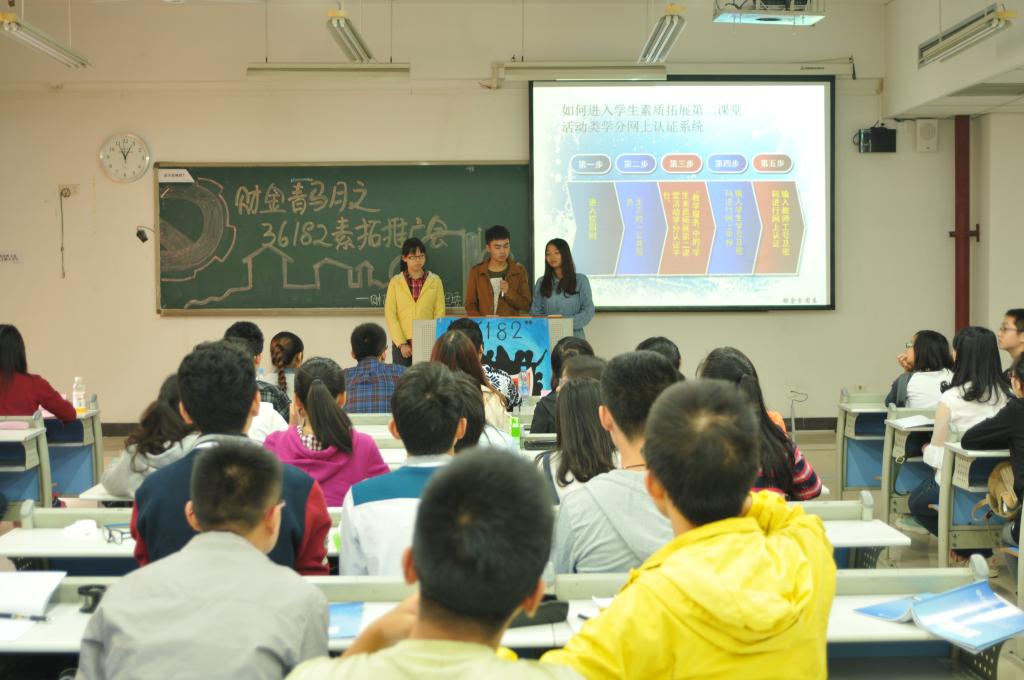 校学生会素质拓展部部长杜星瑶致开场词,她表示,素质拓展旨在提高我校大学生的文化修养和艺术品位,希望大家积极参与其中;财金分团委学生会素质拓展部部长为大家详细讲解了何为“36182”、如何获取素拓分、如何进行网上验证等问题,并为新生答疑解惑。中场一段有趣的知识竞答充分活跃了现场气氛。最后,财金分团委学生会副主席唐梦姣代表学生会表达了对在场大一新生的美好祝愿,希望大家在参加素拓活动的同时,增长课外知识、增强社会实践能力,不仅抓好学习任务,还应注重综合素质的提升。