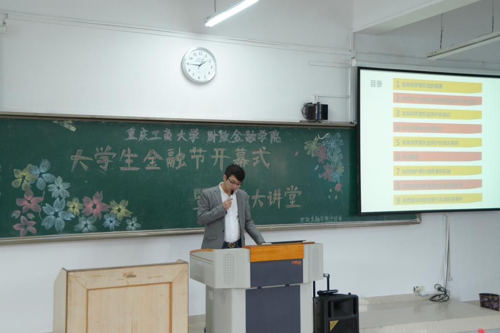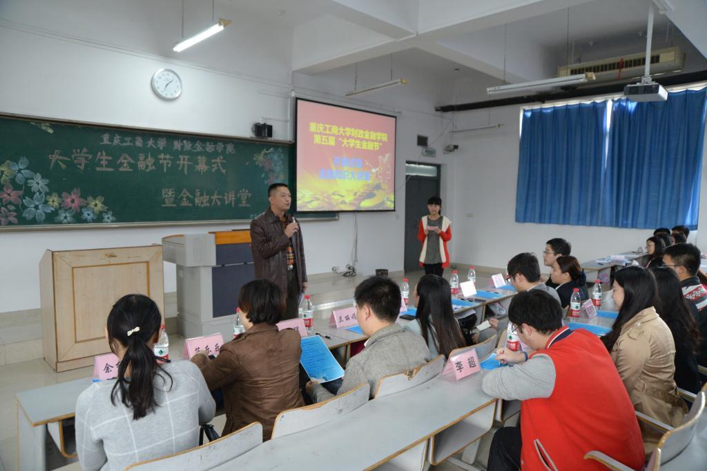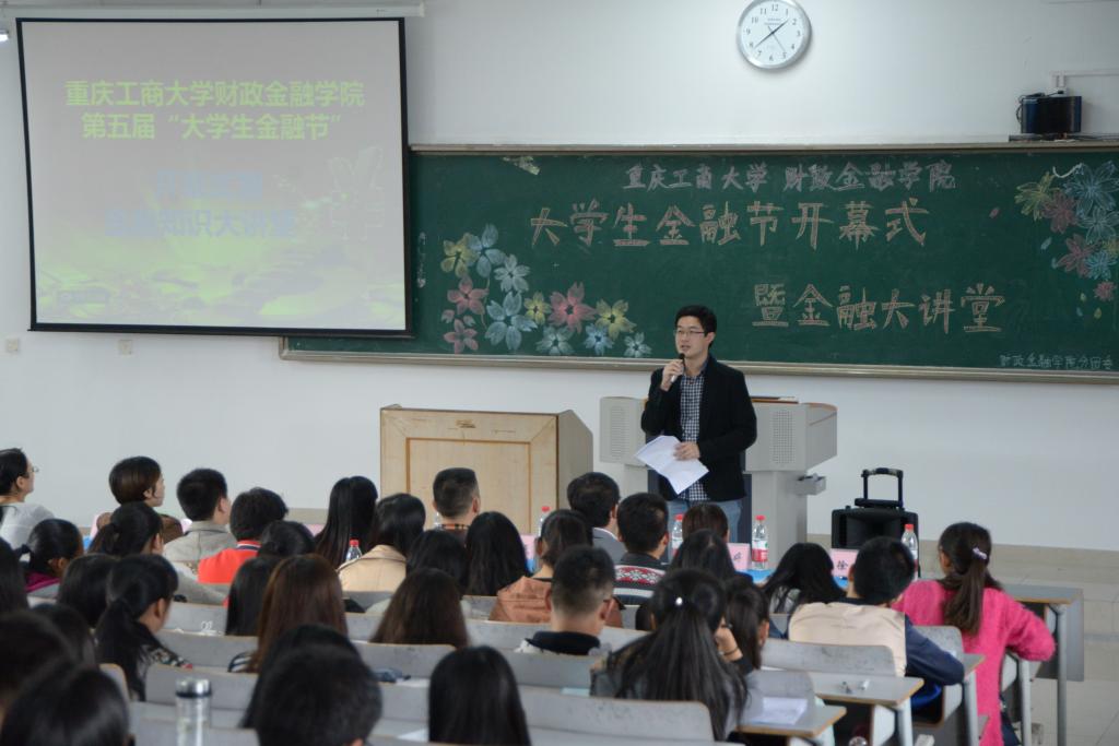 11月13日,由重庆工商大学财政2003网站太阳集团主办的第五届“大学生金融节”开幕式暨金融知识大讲堂在博智楼70421顺利举行。此次开幕式诚邀财政2003网站太阳集团党总支副书记刘代成、学生党支部第一支部书记文理、第三支部书记余红霞、第四支部书记范乐乐、分团委书记徐阔、重庆银行大礼堂支行营业部经理夏浪、销售部经理喻丽婷出席活动。