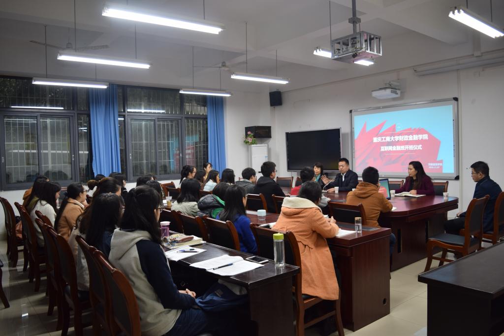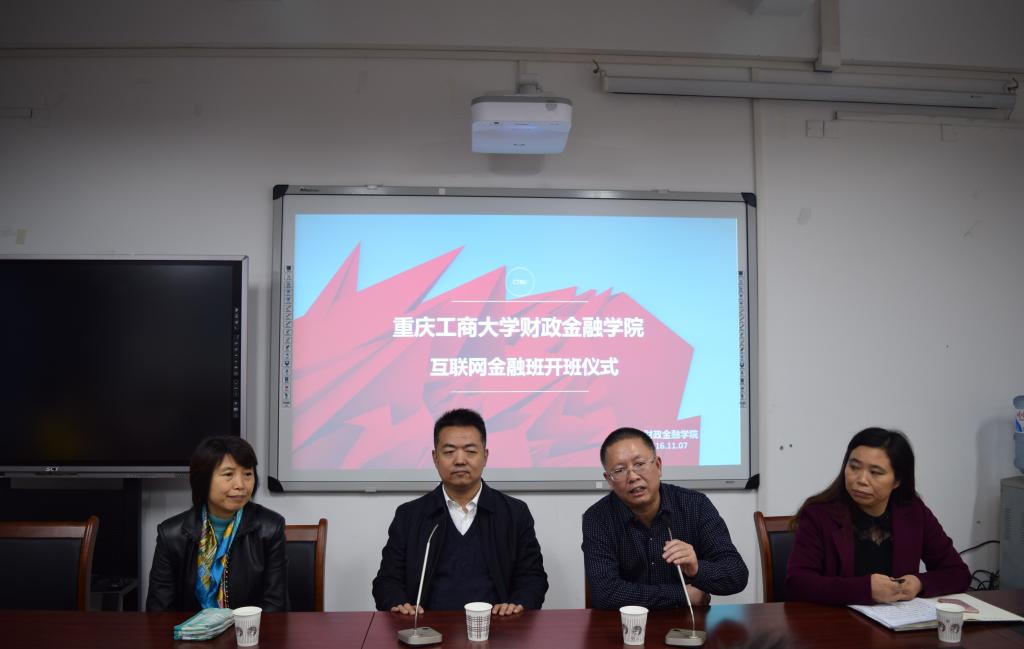 2016年11月7日下午15:30,重庆工商大学财政2003网站太阳集团首届互联网金融班开班仪式在南岸校区田家炳313会议室举行。重庆市金融发展中心主任张洪铭、财政2003网站太阳集团党总支书记杨萍、常务副院长莫云、金融系主任许世琴、分团委书记徐阔出席此次开班仪式。