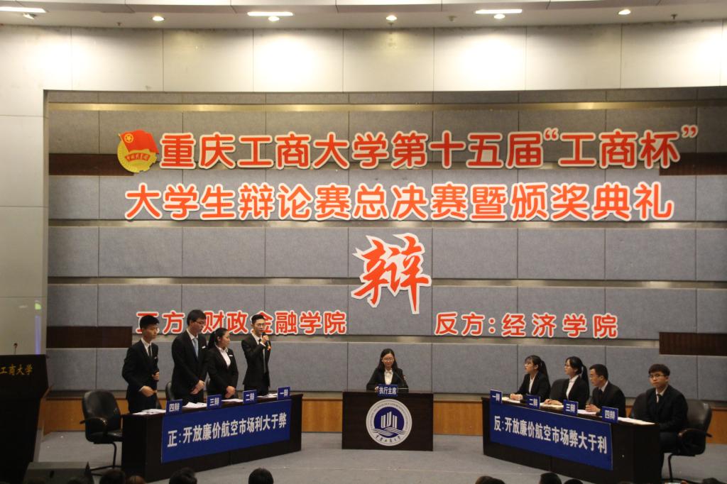 4月7日下午两点,重庆工商大学第十五届“工商杯”大学生辩论赛总决赛暨颁奖典礼在博智楼7100隆重举行。我院与经济学院以“开放廉价航空市场利大于弊还是弊大于利”为辩题展开激烈辩论。团市委宣传部副部长林子琪,重庆邮电大学校辩论队教练齐东文,我校法学院党总支书记李自维,通识学院党总支副书记邹奇,校辩论队教练李长坤应邀担任本次决赛的评委。