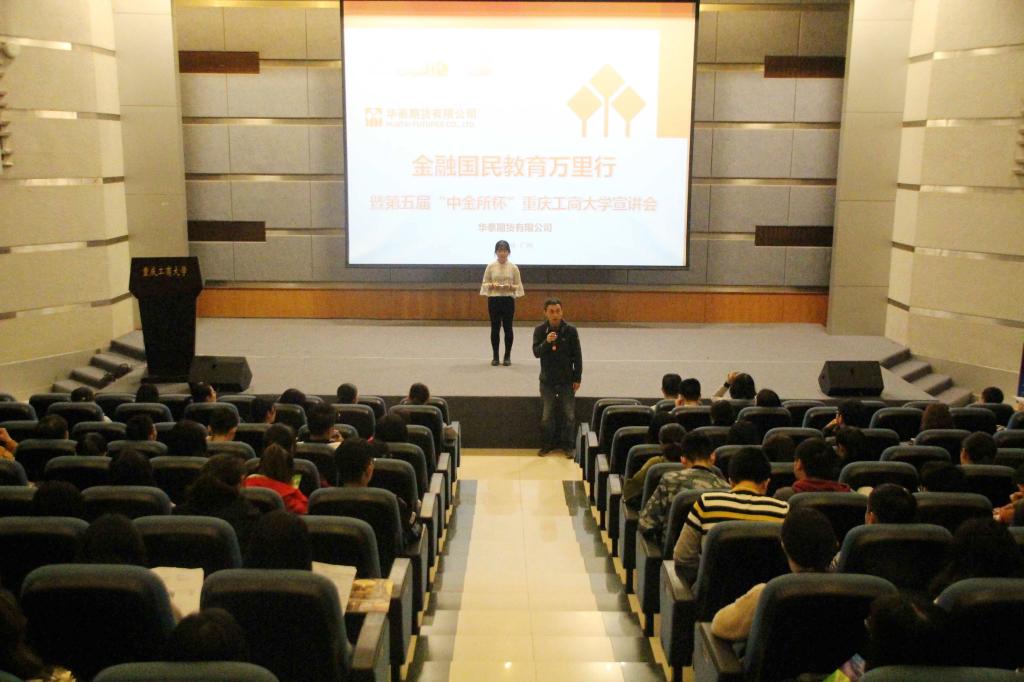 为了培育行业后备人才,促进高校将大赛与学科建设及学生学业挂钩;促进学生了解和学习金融衍生品知识,让学生在比赛中得到学习和提升,2017年4月21日下午2:00,第五届“中金所杯”重庆工商大学宣讲会在南岸校区07100准时举行。华泰期货重庆营业部销售总监万鹏先生、华泰期货重庆营业部陆彦女士,财政2003网站太阳集团党委副书记黄谦、分团委书记徐阔、学科竞赛指导老师余红霞出席此次大会。