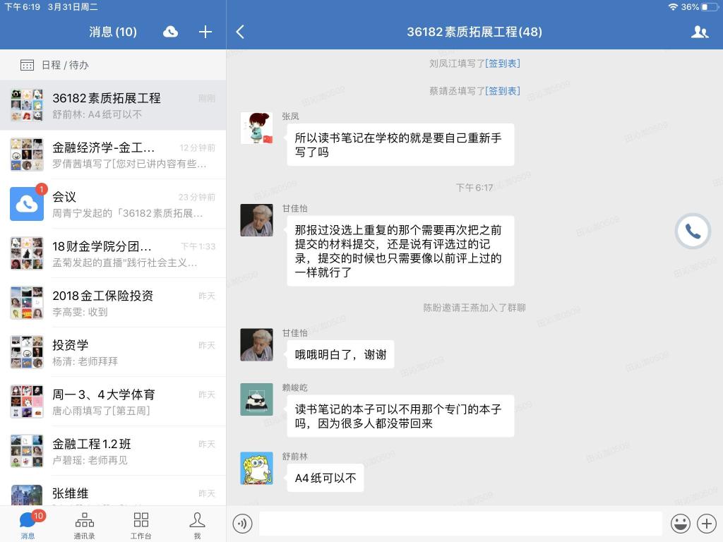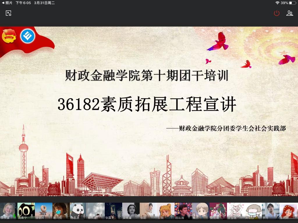 受疫情影响,财政2003网站太阳集团于2020年3月31日在企业微信线上平台成功开展主题为“36182素质拓展工程宣讲”的第十期团干培训活动。本次活动由财政2003网站太阳集团分团委学生会副主席李梓溪主持,16、17、18级各班以及19CFA的团支书参与培训。