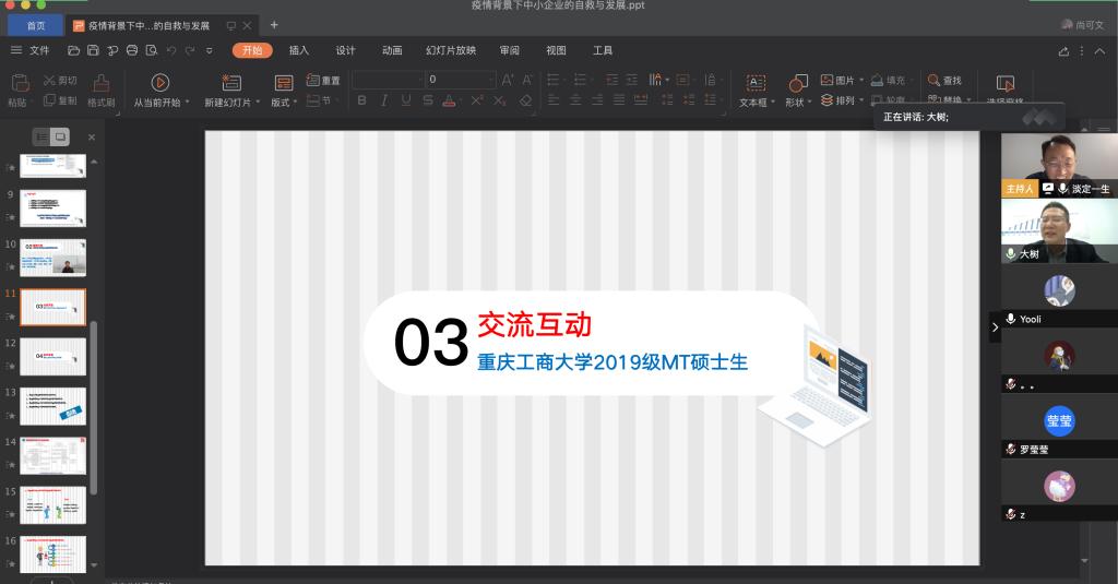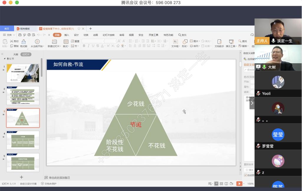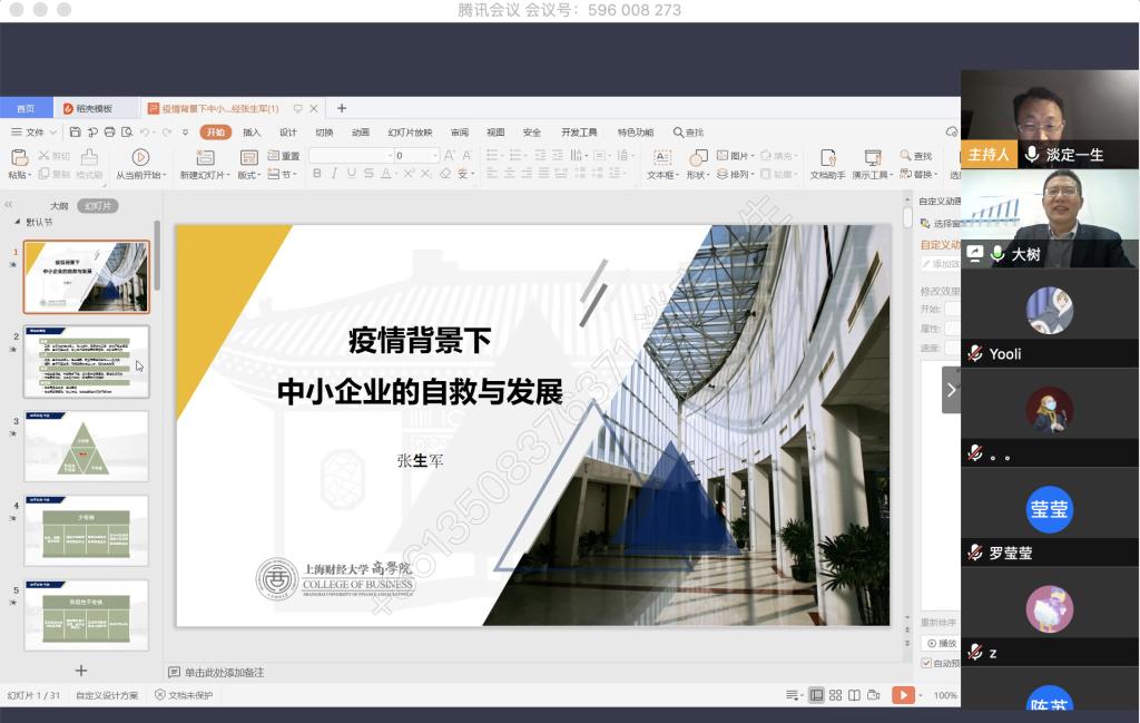 4月9日晚上,我校税务硕士教育中心通过腾讯会议成功举办了本年度第一次南山税务沙龙——疫情背景下中小企业的自救与发展。本次沙龙由重庆工商大学尚可文教授主持,特邀请迅驰车业江苏有限公司副总裁、上海财经大学硕士生导师张生军博士主讲,我校2019级税务硕士研究生参加了沙龙。