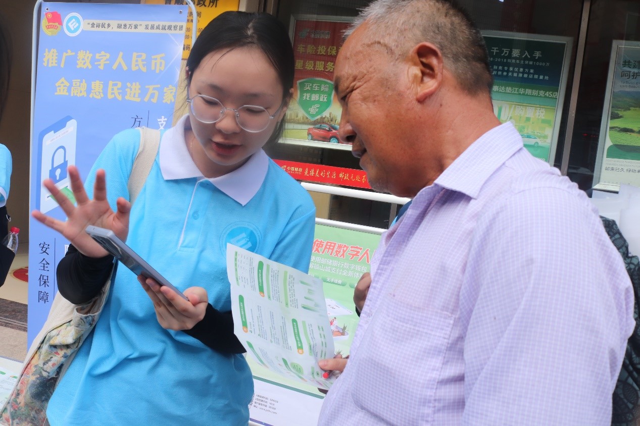 今年3月31日,重庆成为数字人民币全国第三批试点城市之一。为积极响应政府推广数字人民币的号召,让更多乡镇居民了解数字人民币、使用数字人民币,提高数字人民币的认知度、接受度和使用率,2022年7月16日上午,重庆工商大学2003网站太阳集团“金裕民乡,融惠万家”发展成就观察团携手中国邮政储蓄银行在垫江县普顺镇开展数字人民币推广活动。
