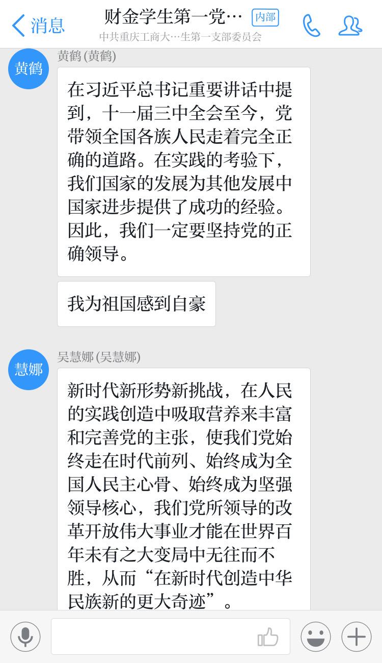 2019年2月15日,财金学生第一党支部组织全体党员进行了寒假第一次交流学习。本次学习由赵利国同志主持,支部全体党员同志参与。交流学习内容包括:1.继续深入学习习近平新时代中国特色社会主义思想和党的十九大精神,重点学习习近平总书记在庆祝改革开放40周年大会上的重要讲话2.由黄琼苇同志分享并简单介绍热点新闻:“新一轮中美贸易战高级别磋商在京开幕”。