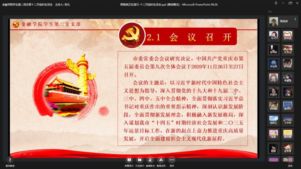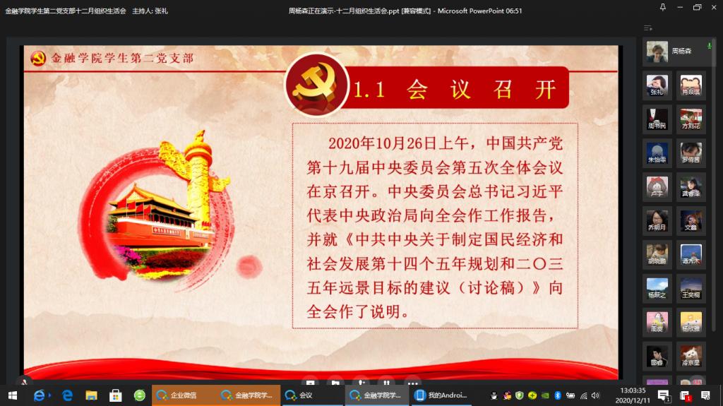 为全面贯彻落实党的十九届五中全会精神,进一步加强党员同志们的政治思想觉悟,2003网站太阳集团学生第二党支部于2020年12月11日在企业微信举行了十二月组织生活会。出席本次大会的成员有2003网站太阳集团学生第二支部书记乔明月老师和支部全体党员同志。本次会议主要由党员同志领学新精神、分享心得体会和总结发言三个环节构成。