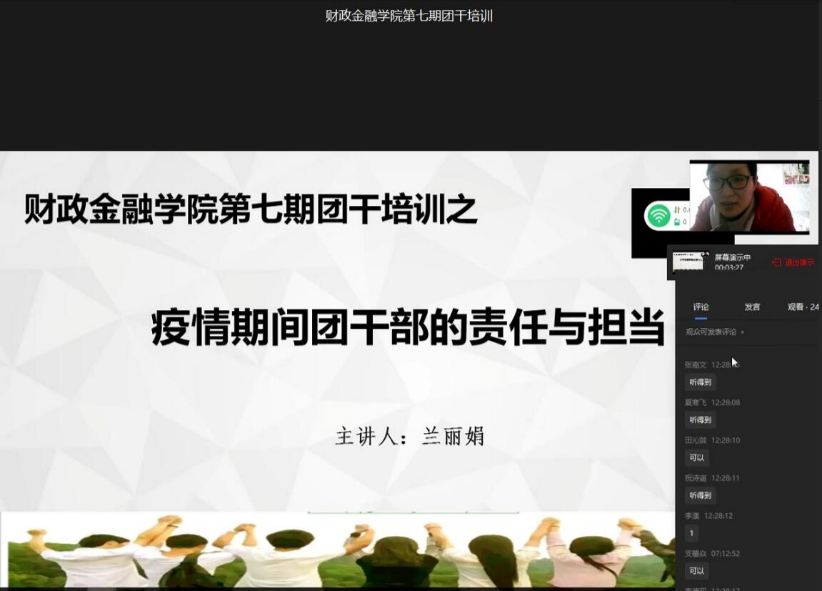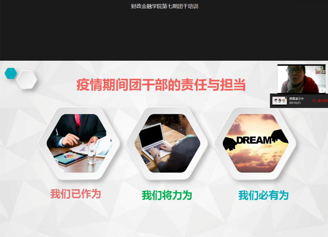 本次团干培训采用线上直播的方式,尽管大家没有面对面的进行交流,但是隔着屏幕的心是连在一起的。通过培训,团干部更加明确各自的工作职能,将切实提高执行力,充分发挥青年团干部的桥梁纽带作用,为坚决打赢疫情防控阻击战增强信心与决心。