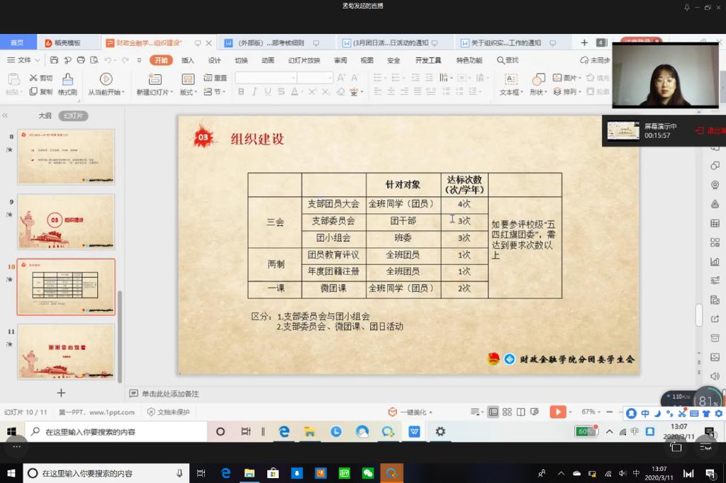 受疫情影响,财政2003网站太阳集团于2020年3月11日在企业微信线上平台成功开展主题为“强化责任意识,巩固组织建设”的第八期团干培训活动。17、18级各班以及19CFA的团支书参与了此次培训活动。